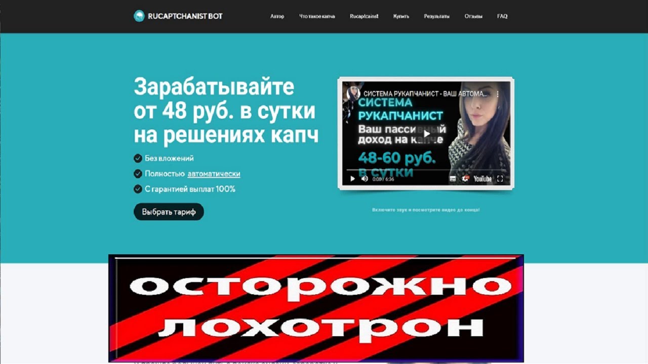 В этом видео мы с вами пробежимся по лохотрону: Рукапчанист (Rucaptchanist Bot), где нам предлагают купить чудо программу, которая будет приносить нам доход в виде заработка на капче. Только по сути перед нами пустышка, так как не каких 48 рублей в день на капче никогда не заработать. В лучшем случае если вам такая программа будет приносить по пару рублей в день, в худшем, если вам заблокируют аккаунт.