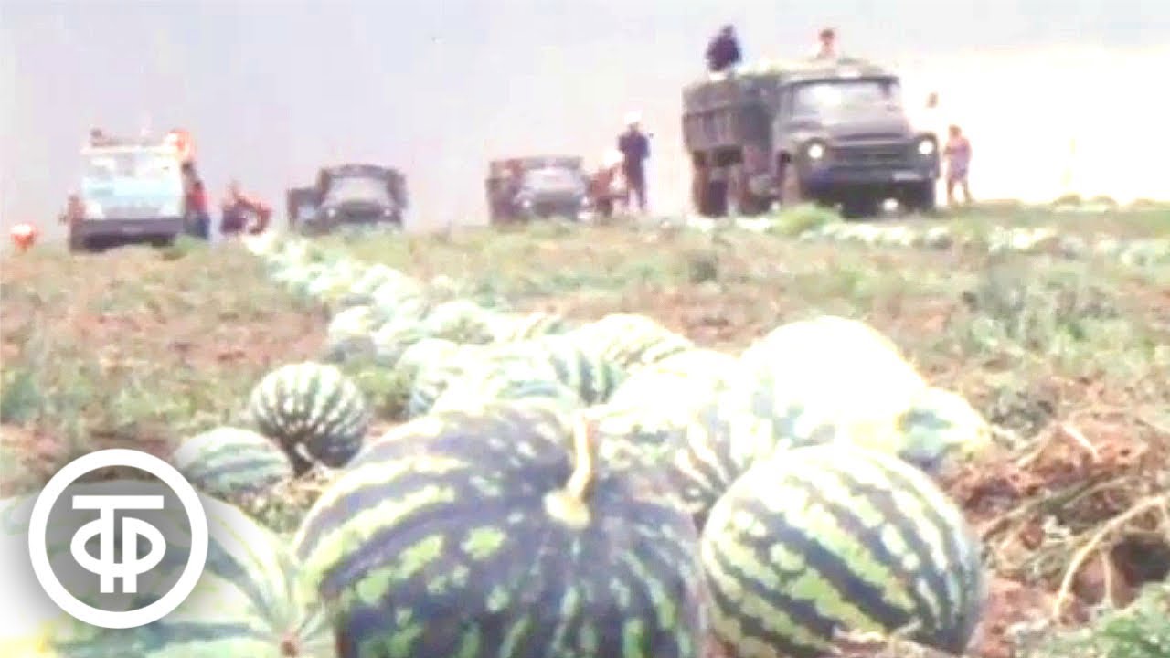 Репортаж из Херсонской области об уборке бахчевых культур в совхозе имени Покрышева и их отправке потребителям.